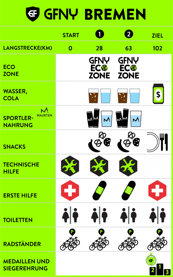 Auf dem Rückweg ins Ziel nutzt du dieselben Straßen wie beim Hinfahren zur Runde. Die Finishzeit für die Langstrecke wird bei km 95 genommen, wo eine lange Gerade perfekte Bedingungen für einen Zielsprint bietet. An dieser Linie endet deine offizielle Rennzeit. Die letzten Kilometer zurück zum feierlichen Finish im Tabakquartier sind neutralisiert, um die Sicherheit aller Fahrer zu gewährleisten. Nutze diesen Abschnitt zum lockeren Ausrollen entlang des malerischen Flusses Ochtum und genieße den Moment mit deinen Mitstreitern. Achtung: erst mit dem Überqueren der Ziellinie im Tabakquartier gilt dein Rennen als vollständig beendet und du wirst offiziell als Finisher gelistet. Dort erhältst du auch deine GFNY-Finisher-Medaille, dein After-Race-Essen und es findet die Siegerehrung statt.